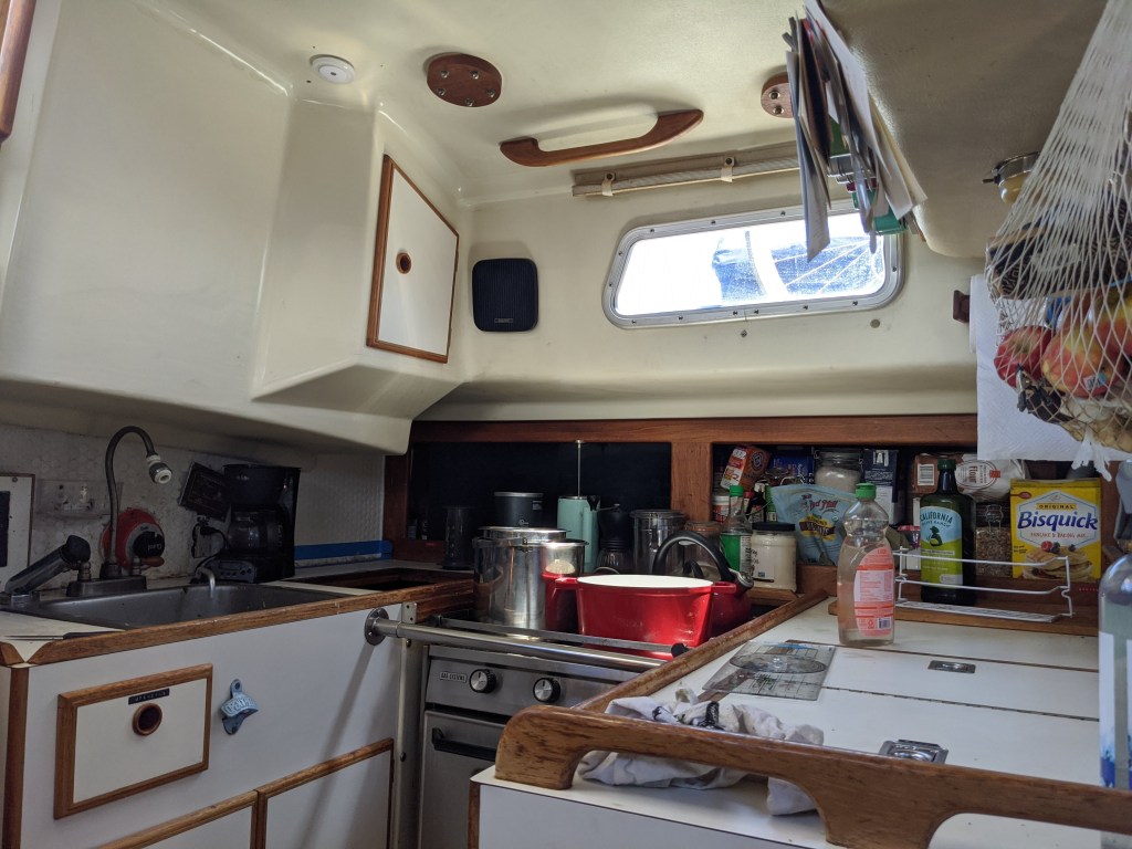 The aft side of the galley (pictured above and to the left) housed a top loading cupboard with the propensity to collect water from the sink and mold. It often housed lesser used pots, dry goods, and other bits and bobs. Reaching into it often left your arm with some scum from the sink runoff.