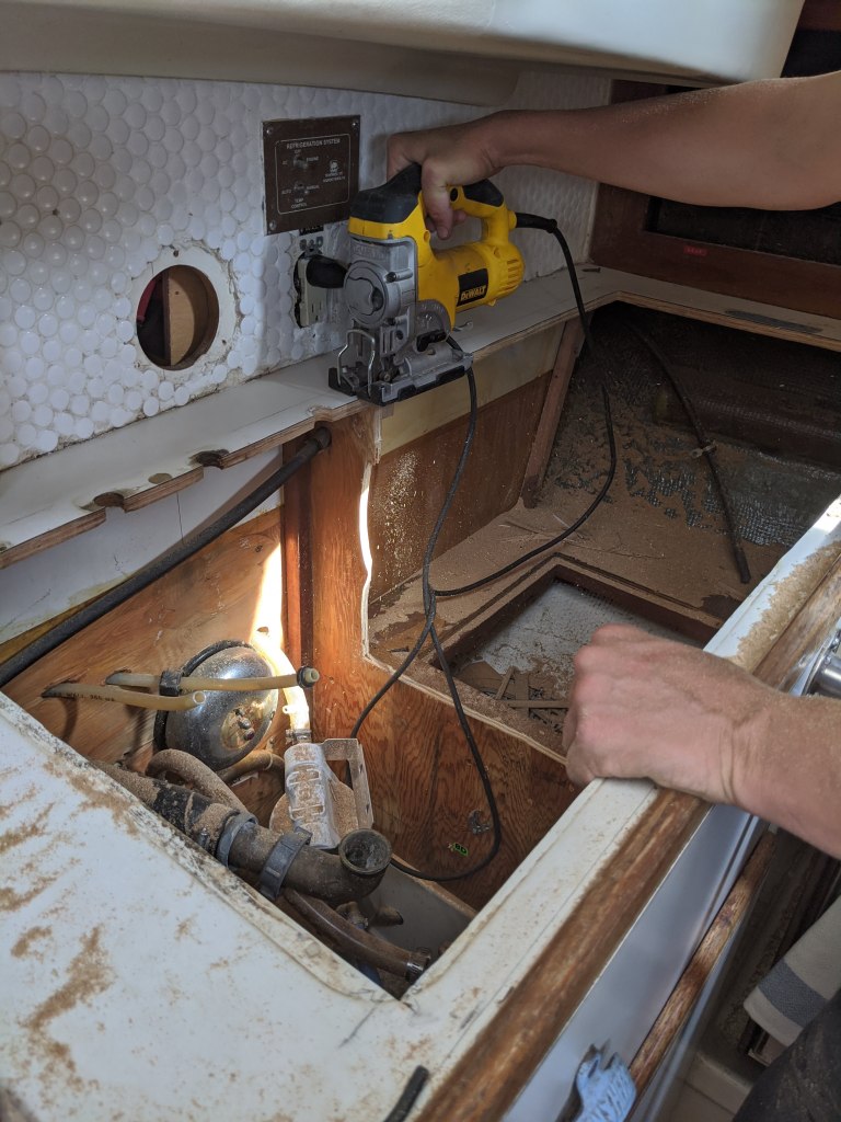We removed the old sink and faucet, cut away the countertop, and took an extra trip to the hardware store for hose fittings. Earlier in the summer, we installed most of a tile backsplash, before realizing we wanted to remove the battery switch (formerly installed in the hole below). Boat projects tend to succumb to scope creep, and this one was no exception.