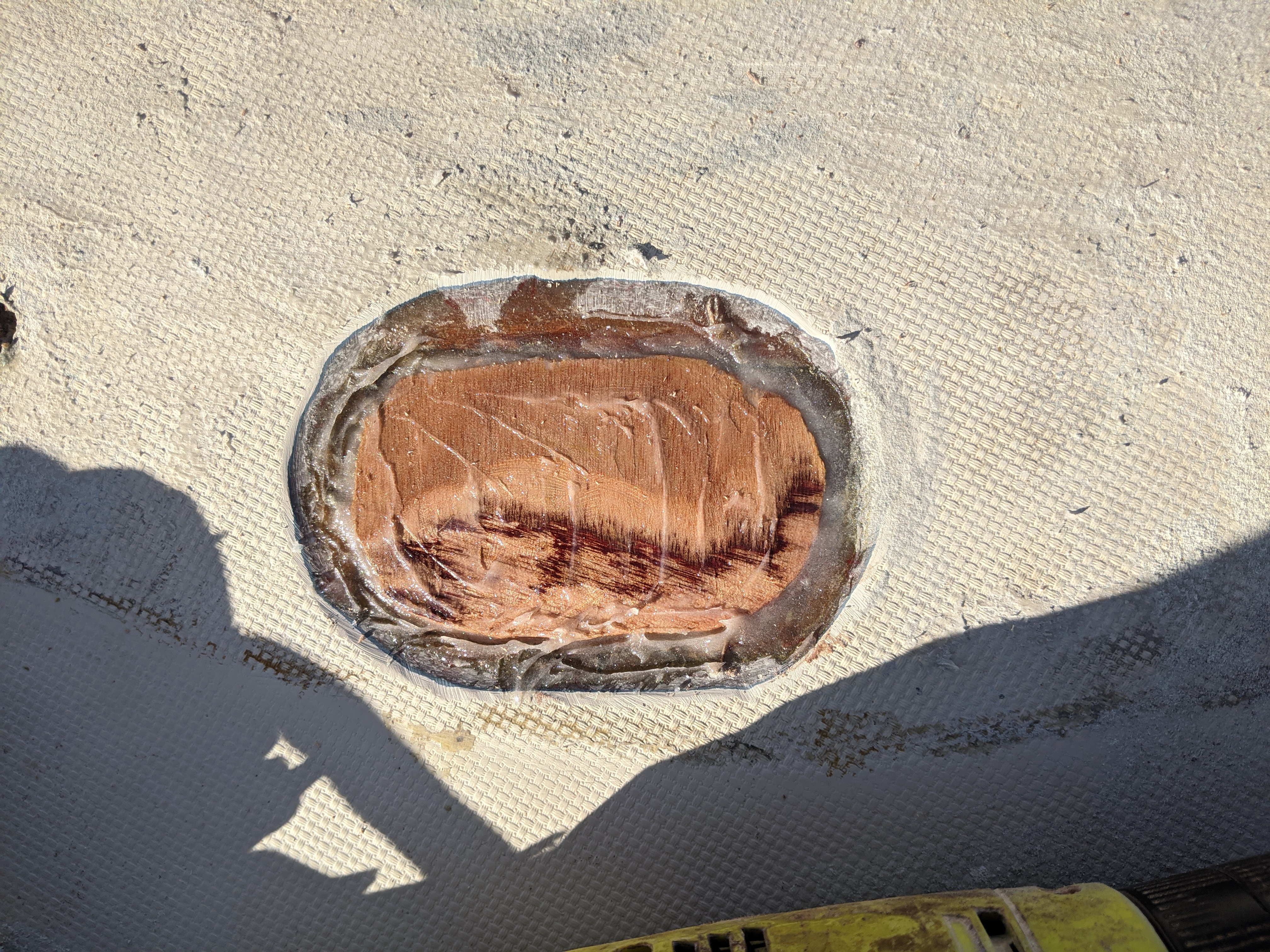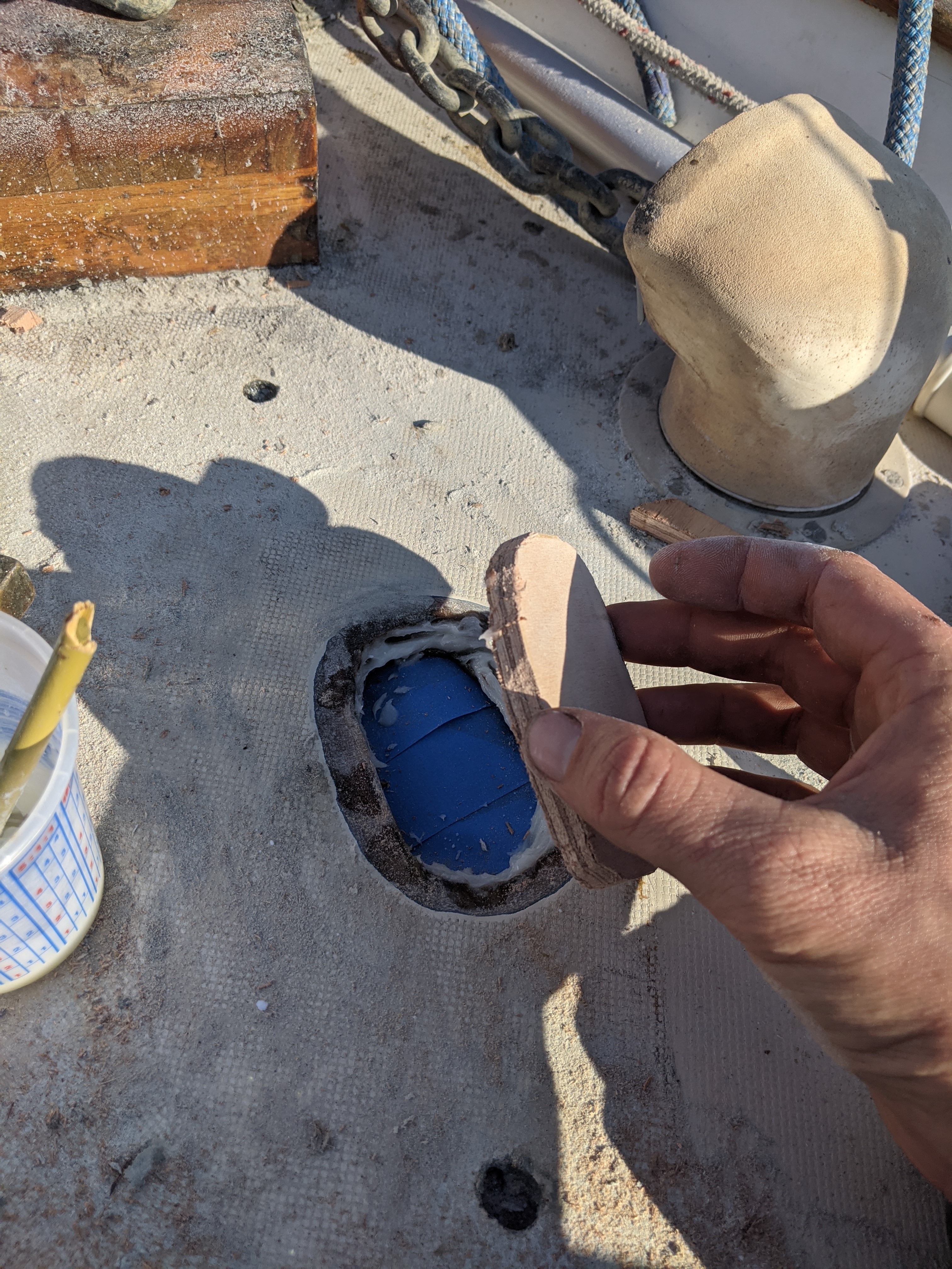 The first step was to properly fill and repair the hole from the previous windlass. Well actually, the real first step was to remove the old windlass, which consisted of removing the nuts from under the deck, peeling away the old sealant, and hulking it off (no pictures of this sorry). The chain-fall hole of the old windlass doesn’t line up with where we’ll need the new one to be so I had to fill and strengthen the old hole as it will now essentially be part of the deck structure. I heard from an old boatyard friend that hole bigger than a quarter in a cored fiberglass structure should be replaced with a core material, like the area around it. One can usually use thickened epoxy for filling most small holes, but the hardness of cured epoxy placed in a big enough hole of a flexible fiberglass deck can work the epoxy plug out over time while the rest of the deck flexes around it.