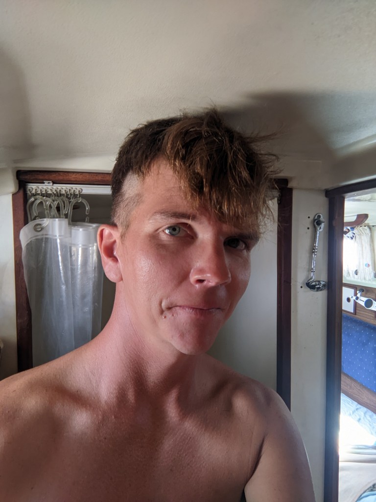 We had a swim and scramble around in the tide pools and then headed out. Scott proposed haircuts underway and I accidentally cut a bit short. Friends, be sure the guard is back on before any finishing touches.